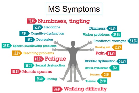 MS kan opptre hvor som helst i sentralnervesystemet, dvs at alle områder i hjerne og ryggmarg kan rammes, noe som medfører at symptomene ved MS kan være svært forskjellig fra person til person, og kan variere over tid hos den enkelte. Det finnes noen vanlige symptomer, men min erfaring med MS behøver ikke være den samme erfaringen en annen har.